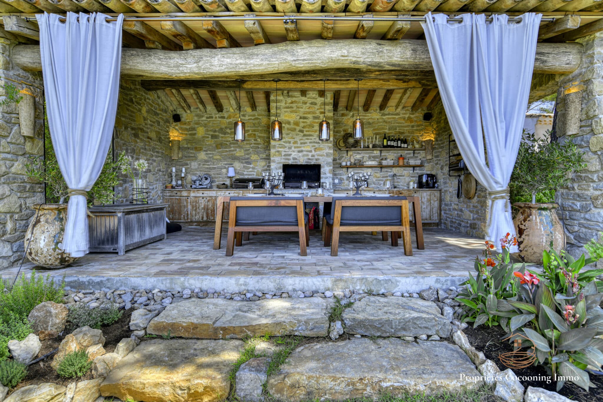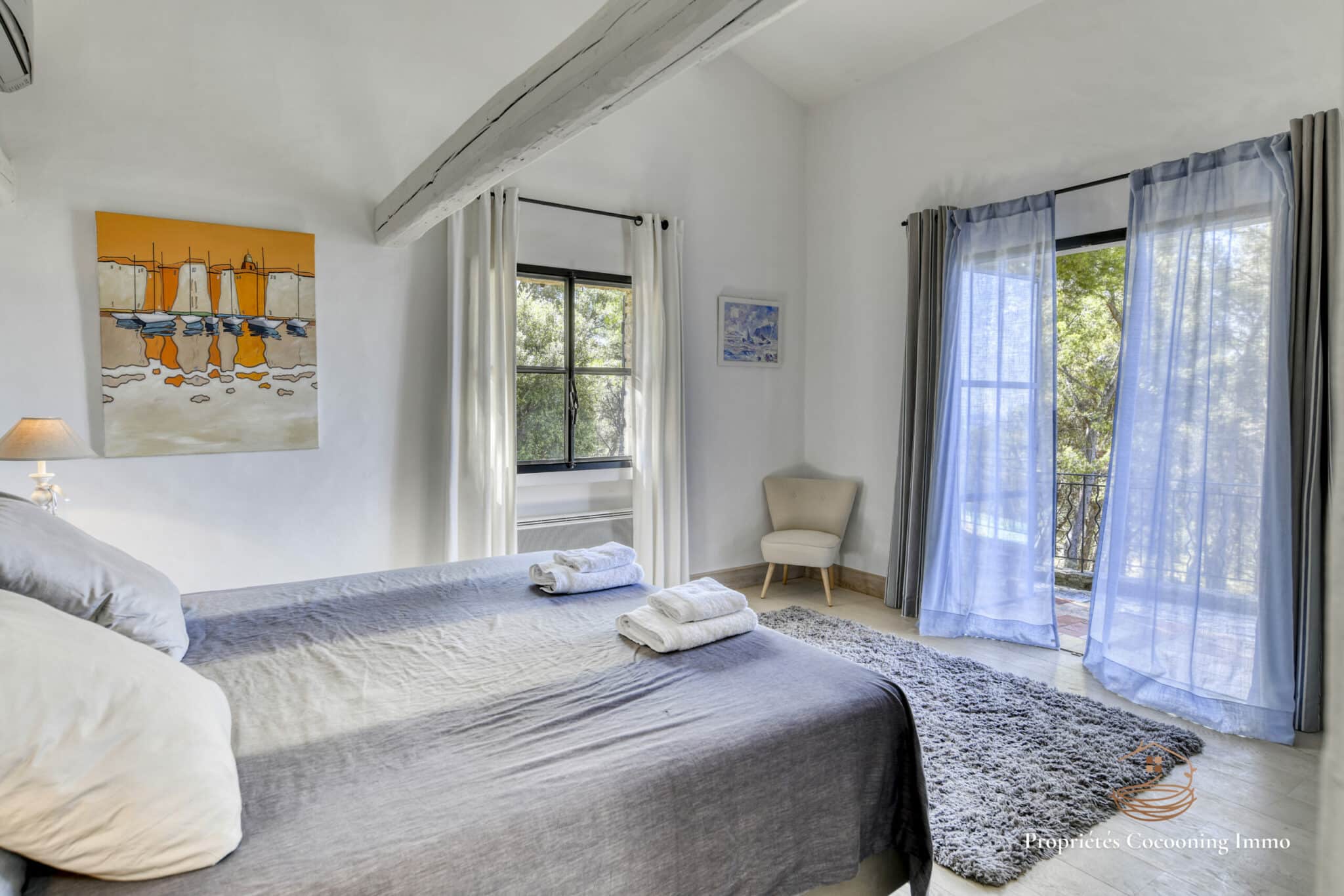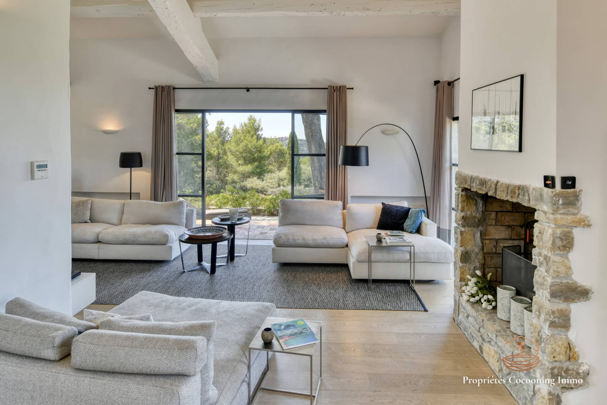 In its 2-hectare park with its 250 olive trees, this property with refined decoration offers generous and friendly living spaces: vast cathedral living room with fireplace, shaded terrace, outdoor kitchen/dining room, pool house, and heated swimming pool.