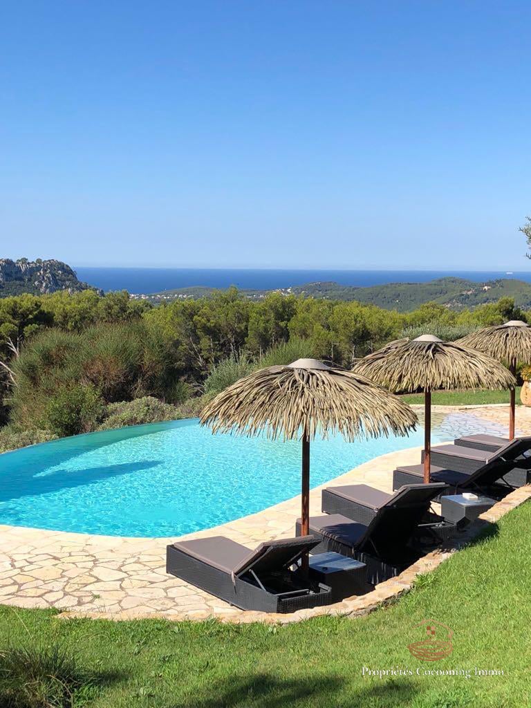 It is ideally located in a quiet environment, on the hillside with a breathtaking view of the Mediterranean and the Gros Cerebin mountain.